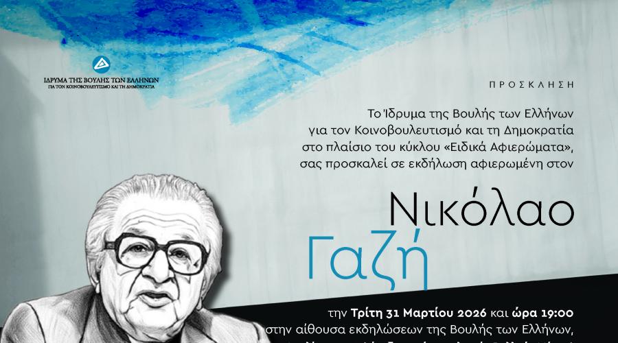 Το Ίδρυμα της Βουλής των Ελλήνων για τον Κοινοβουλευτισμό και τη Δημοκρατία στο πλαίσιο του κύκλου Ειδικά Αφιερώματα διοργανώνει εκδήλωση για τη ζωή και το έργο του Νικολάου Γαζή την Τρίτη, 31 Μαρτίου 2026 και ώρα 19:00 στην αίθουσα εκδηλώσεων της Βουλή των Ελλήνων, Αμαλίας 22-24, είσοδος επί της πλατείας Ραλλούς Μάνου.