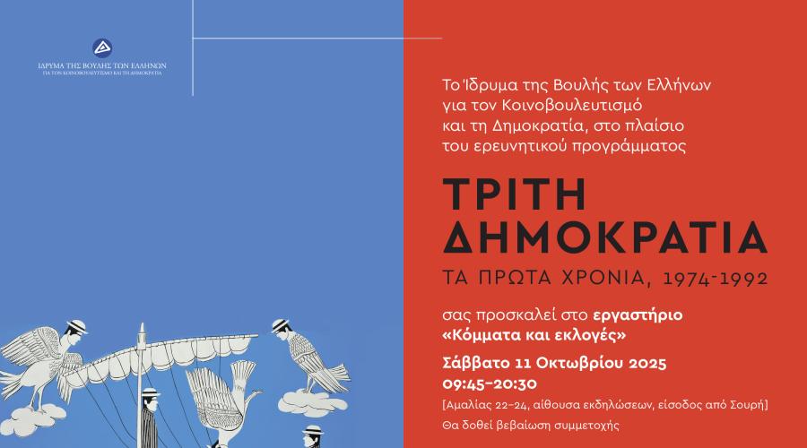 Το Ίδρυμα της Βουλής των Ελλήνων για τον Κοινοβουλευτισμό και τη Δημοκρατία στο πλαίσιο του ερευνητικού προγράμματος Τρίτη Δημοκρατία τα πρώτα χρόνια, 1974-1992 παρουσιάζει κύκλο εργαστηρίων που ξεδιπλώνονται σε τέσσερις θεματικούς άξονες: τη συνταγματική εξέλιξη, τα κόμματα και τις εκλογές, την κοινωνία των  πολιτών, και την εξωτερική πολιτική.