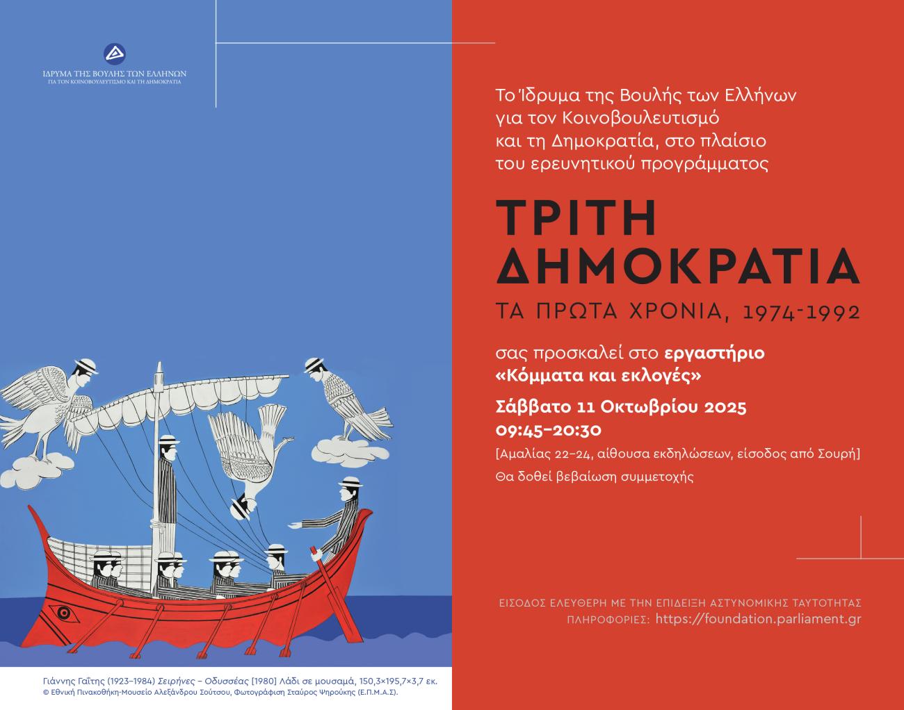 Το εργαστήριο με τίτλο Κόμματα και εκλογές θα πραγματοποιηθεί το Σάββατο, 11 Οκτωβρίου 2025 ώρα 09:45-20:30 στην αίθουσα εκδηλώσεων της Βουλής των Ελλήνων, Αμαλίας 22-24, είσοδος από την οδό Σουρή.