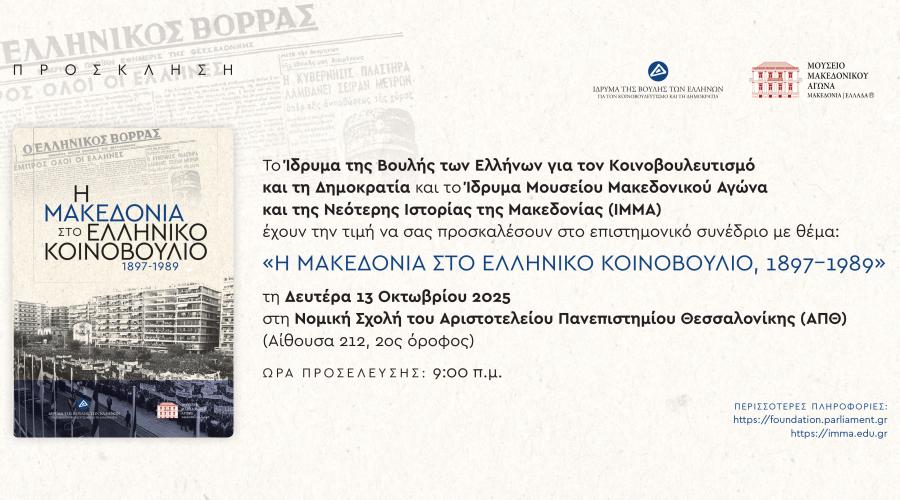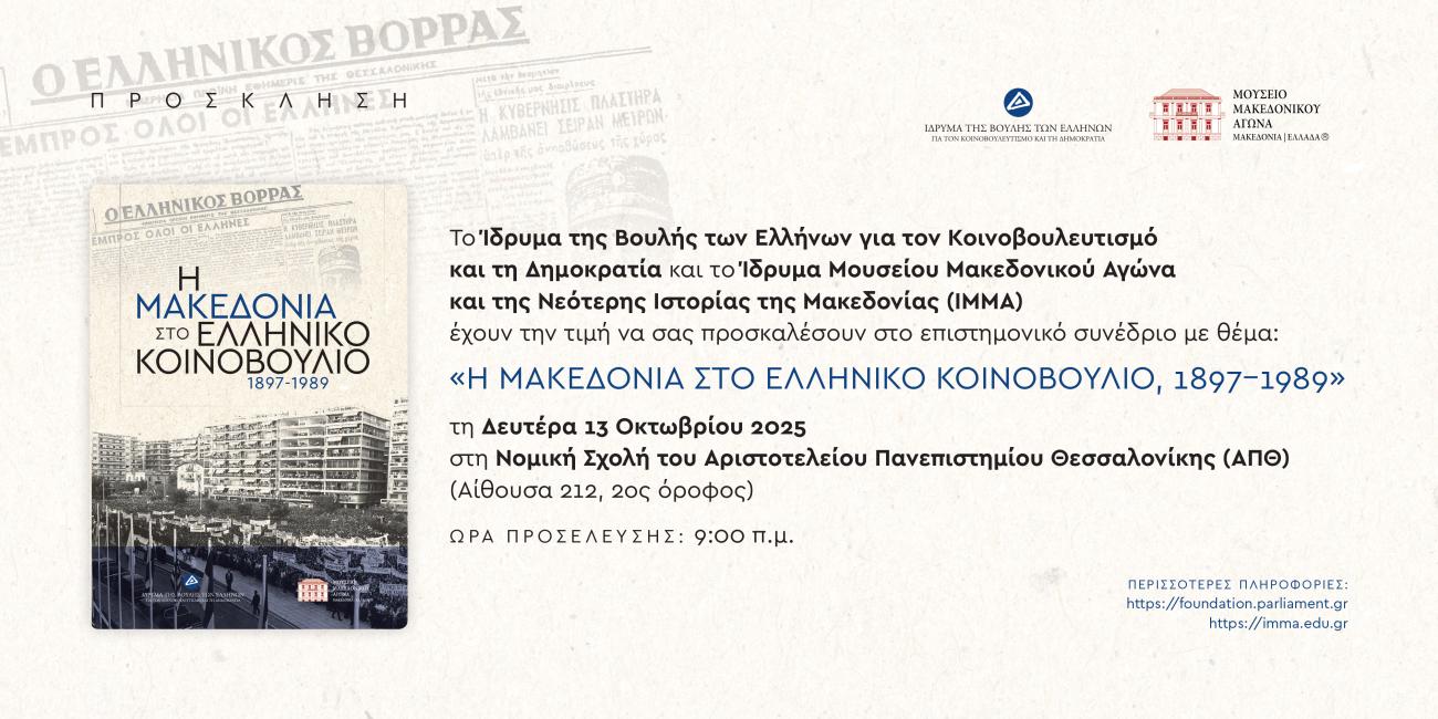 Το Ίδρυμα Μουσείου Μακεδονικού Αγώνα και της Νεότερης Ιστορίας της Μακεδονίας (IMMA) και το Ίδρυμα της Βουλής των Ελλήνων για τον Κοινοβουλευτισμό και τη Δημοκρατία, με αφορμή την έκδοση των αποτελεσμάτων του διετούς ερευνητικού προγράμματος των δύο Ιδρυμάτων με τη μορφή συλλογικού τόμου, έχουν την τιμή να σας προσκαλέσουν στο επιστημονικό συνέδριο με θέμα: