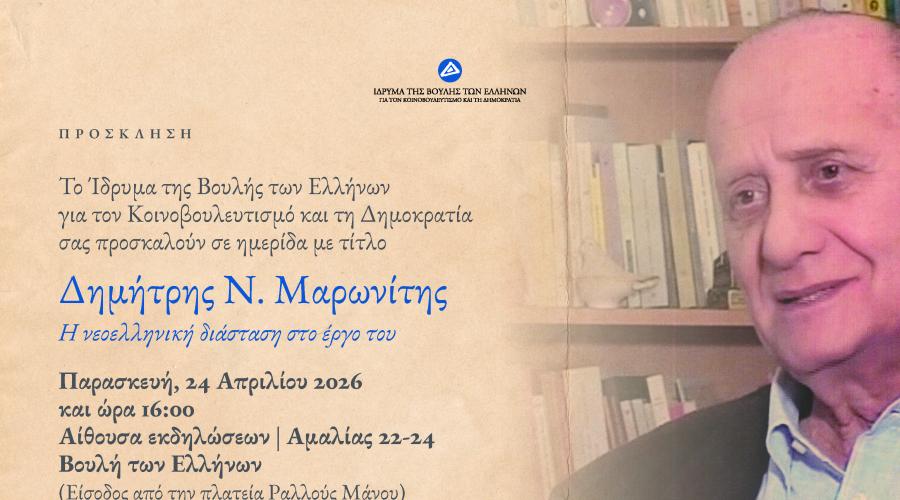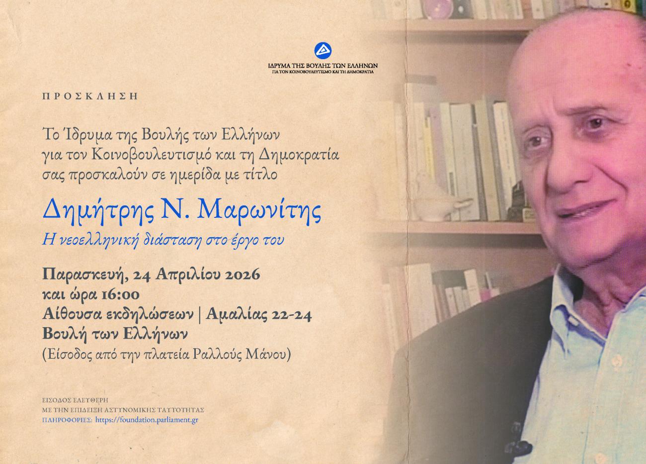 Το Ίδρυμα της Βουλής των Ελλήνων για τον Κοινοβουλευτισμό και τη Δημοκρατία διοργανώνει ημερίδα με τίτλο Δημήτρης Ν. Μαρωνίτης. Η νεοελληνική διάσταση στο έργο του την Παρασκευή 24 Απριλίου 2026 και ώρα 16:00 στην αίθουσα εκδηλώσεων της Βουλής των Ελλήνων, Αμαλίας 22-24, είσοδος από την πλατεία Ραλλούς Μάνου.