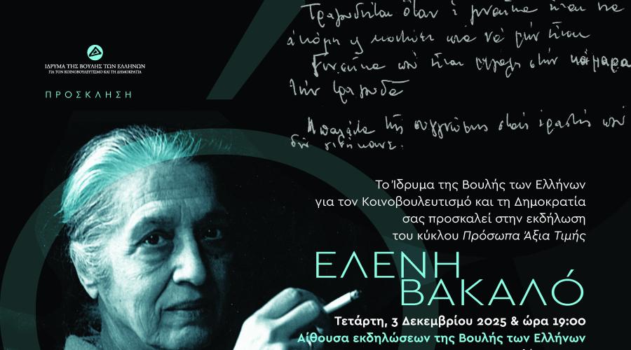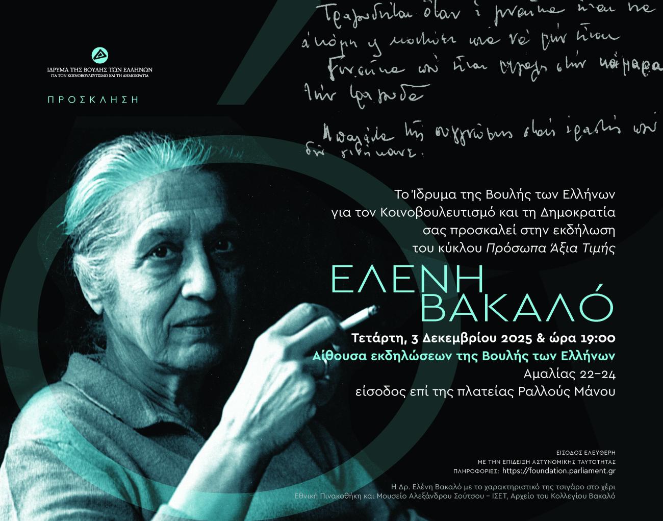Το Ίδρυμα της Βουλής των Ελλήνων για τον Κοινοβουλευτισμό και τη Δημοκρατία στο πλαίσιο του κύκλου Πρόσωπα Άξια Τιμής διοργανώνει εκδήλωση για τη ζωή και το έργο της Ελένης Βακαλό την Τετάρτη, 3 Δεκεμβρίου 2025 και ώρα 19:00 στην αίθουσα εκδηλώσεων της Βουλή των Ελλήνων, Αμαλίας 22-24, είσοδος επί της πλατείας Ραλλούς Μάνου.